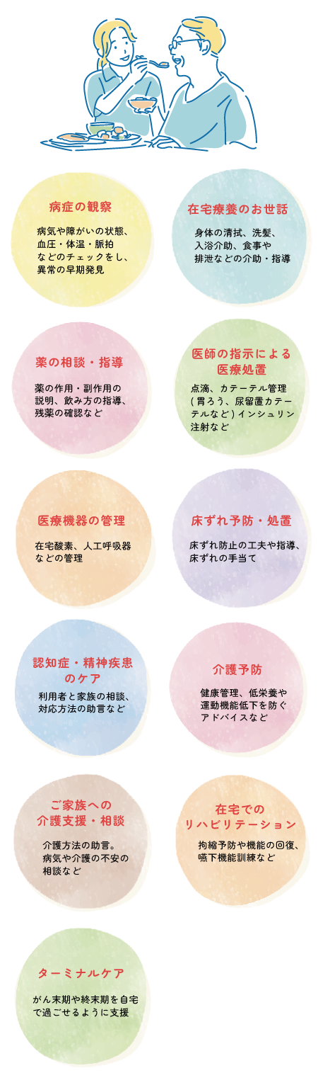 訪問看護ステーションのスタッフが利用者様のご家庭を訪問し、病状や療養生活を看護の専門家の目で見守り、適切な判断に基づいたケアとアドバイスで、24時間365日対応し、在宅での療養生活が送れるように支援します。